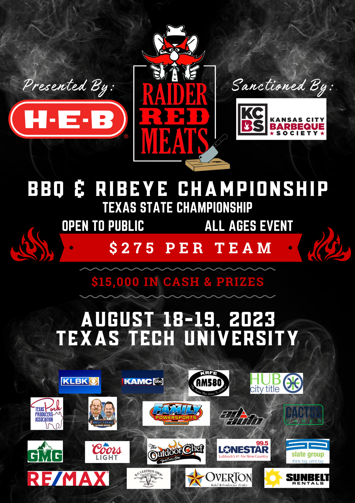 EVENT: Presented by H-E-B and sanctioned by KCBS the annual Raider Red Meats Barbeque and Ribeye Championship Cook-Off will be hosted at Texas Tech.