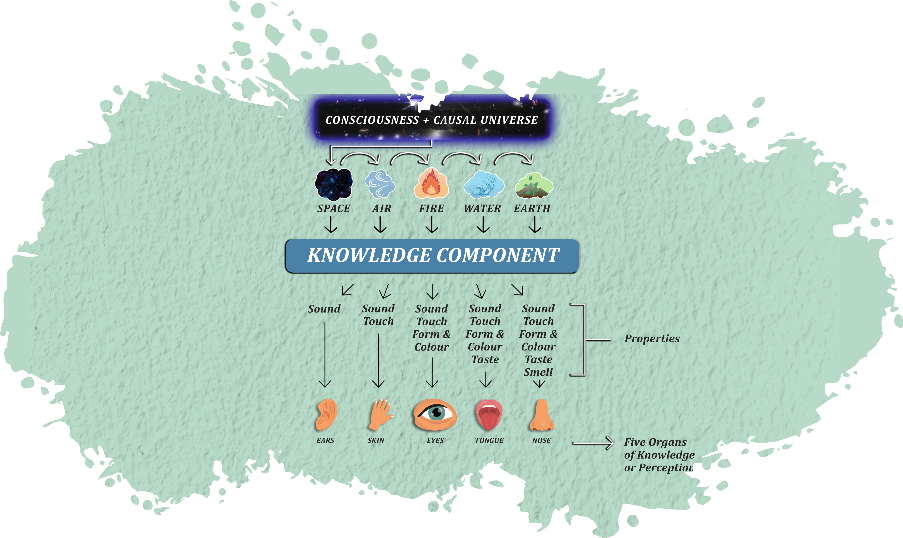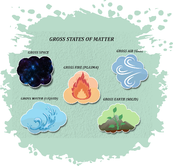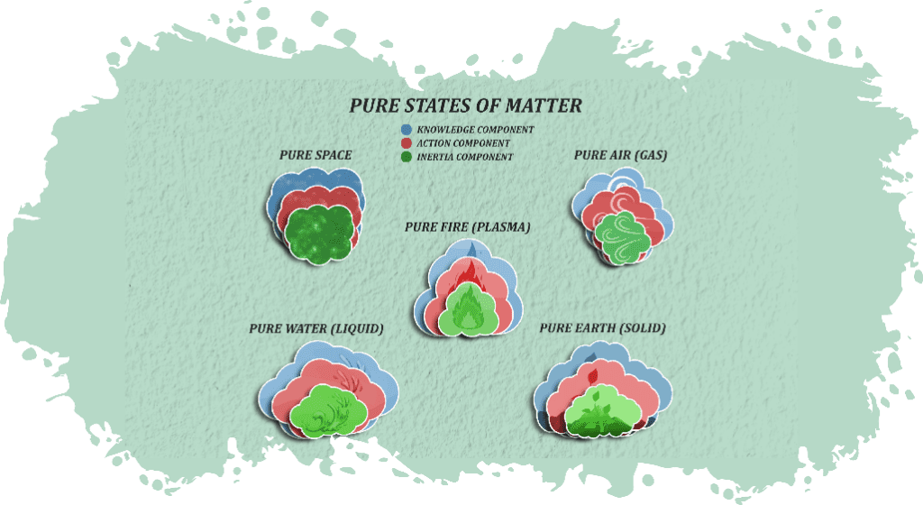 Thus, Space is the first to manifest, followed by Air (Gas), Fire (Plasma), Water (Liquid), and Earth (Solid). Each of these pure states of matter also contains its associated sensory property: Space contains Sound, Air contains Touch & sound, Fire contains Sight, Touch & Sound, Water contains Taste, Sight, Touch & Sound and Earth contains Smell, Taste, Sight, Touch & Sound.