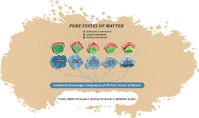 Then, the intrinsic property of Knowledge asserts itself through all five pure states of matter together, collectively – resulting in the formation of the five components of the inner personality—the Ego, the Memory, the Gross and Subtle Intellects, and the Mind. With this, the intrinsic property of knowledge has fully expended itself; then the intrinsic property of Action is next to arise.