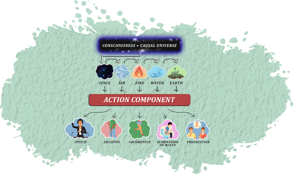 As before, the property of Action first expresses itself through each of the pure states of matter individually, which give rise to the five power centers of action, Speech, Manipulation, Locomotion, Excretion, and Reproduction.