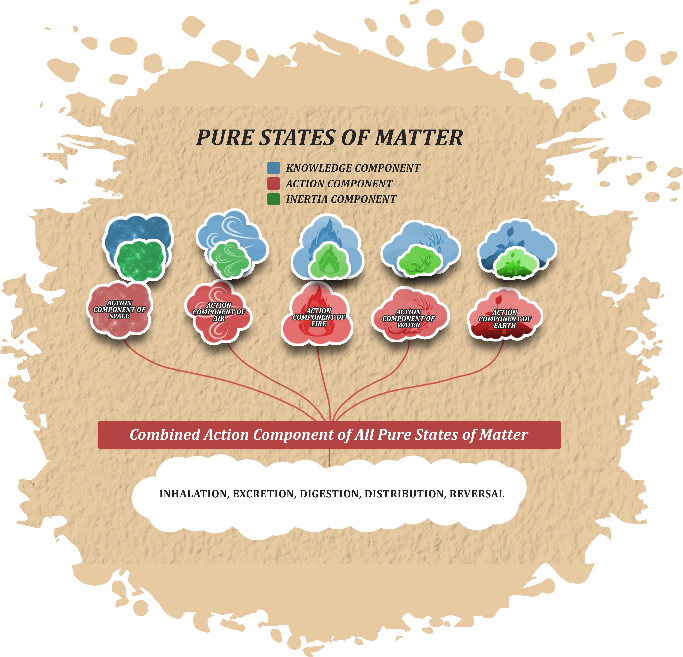 The property of Action next asserts itself through all five pure states of matter, which collectively give rise to the five power centers of physiological function, the synthetic systems that enable life. With this, the intrinsic property of action has fully expended itself, and all 20 subtle components of the human subtle body have been formed.