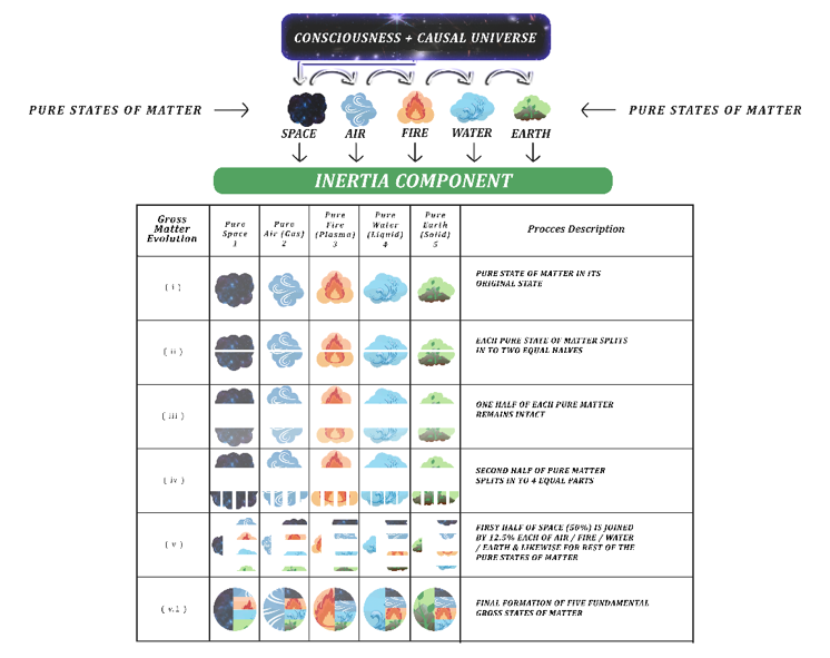 First, INERTIA acts through each of the Five Pure States of Matter, manifesting each of the corresponding gross states of matter. However, because each state of gross matter cannot, by definition, exist in isolation, its PURE STATE!