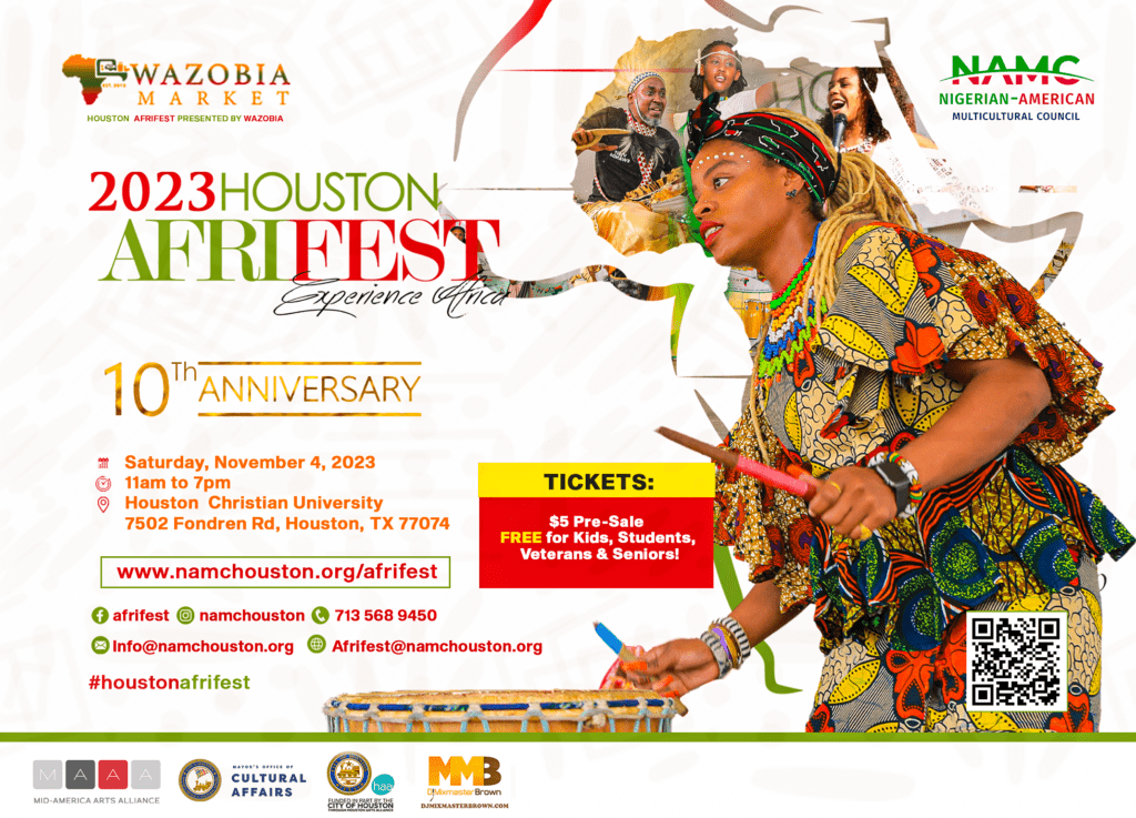 Houston, the most diverse city in the U.S. will again take center stage as it pays tribute to the continent of Africa. On Saturday, November 4, 2023 the Nigerian American Multicultural Council (NAMC) will host its 10th annual Houston AfriFEST – an anniversary edition of the Festival of African Arts, Culture, and Entertainment from 11:00 a.m. to 7:00 p.m. on the grounds of the Houston Christian University, located at 7502 Fondren Rd., Houston, TX 77074.