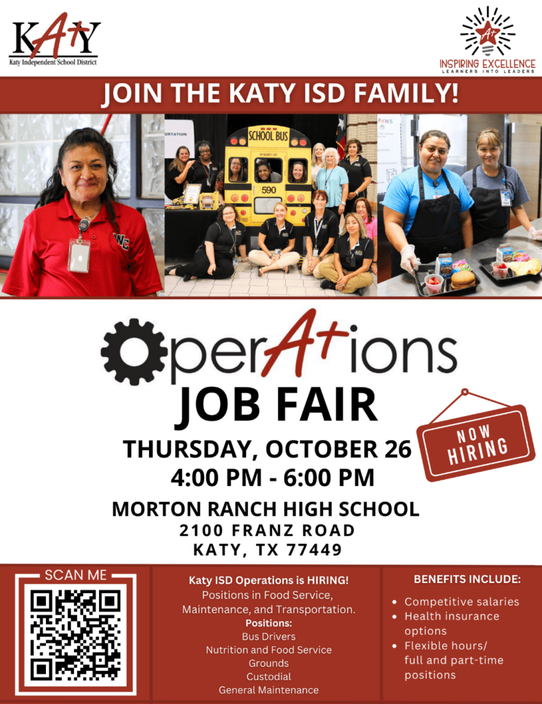 Seeking an opportunity to join the #1 school district in the Greater Houston Area? Mark your calendar for the Katy ISD Operations Job Fair on October 26! The district is actively recruiting for openings in the Nutrition & Food Services, Maintenance & Operations and Transportation departments.