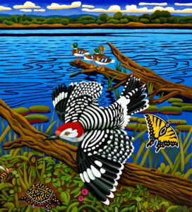 - Billy Hassell, Red-bellied Woodpecker with Mallards, Daingerfield State Park, 2021, oil on canvas, 40×30 in.