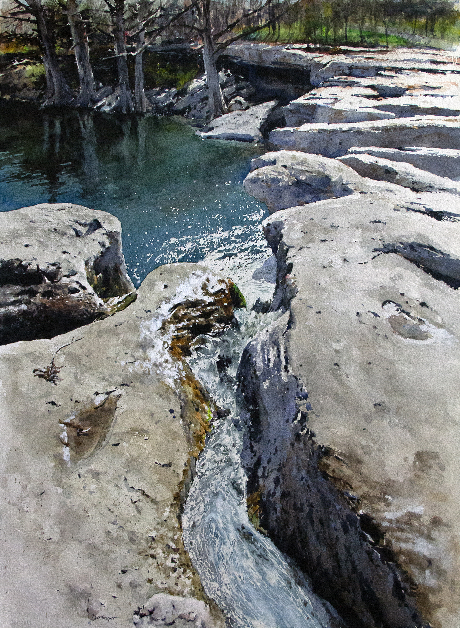 - Ric Dentinger, Cascade, McKinney Falls State Park, 2020, watercolor on paper, 30×22 in.