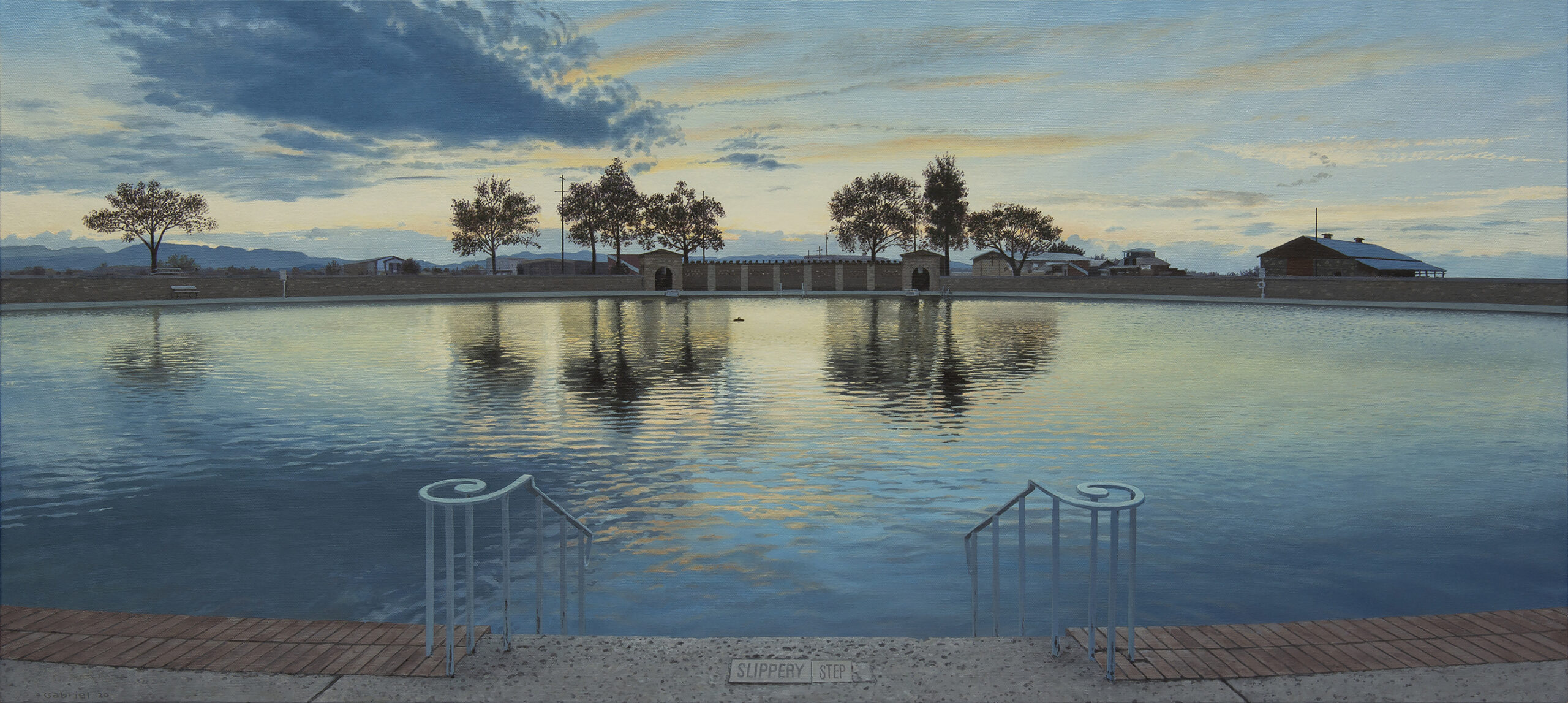 - Pat Gabriel, Slippery Step, Balmorhea State Park, 2020, oil on canvas, 18×40 in.