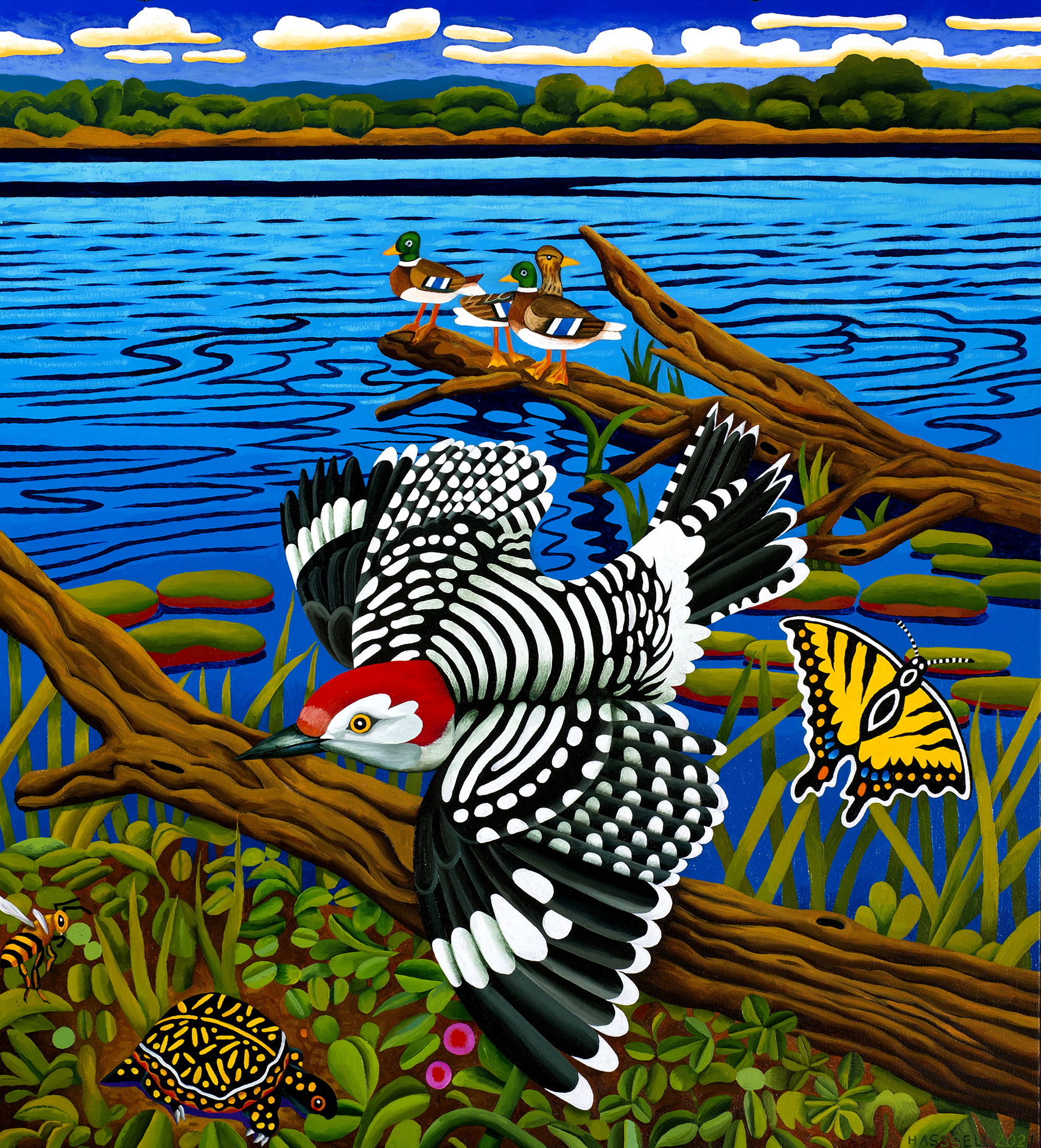 - Billy Hassell, Red-bellied Woodpecker with Mallards, Daingerfield State Park, 2021, oil on canvas, 40×30 in.
