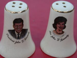 reaching today and offered much to impact our national culture and character in many ways. Kennedy collectibles run the gamut from Jack and Jacqui salt and pepper shakers, 1960s campaign posters, ceramic figurines of the Kennedy children Caroline and John Jr., Kennedy/Johnson cigarette lighters, wicker chairs and other furnishings from the Kennedy compound on Hyannis, Cape Cod, MA and many other objects chronicling the events of the Kennedy presidency and family life.