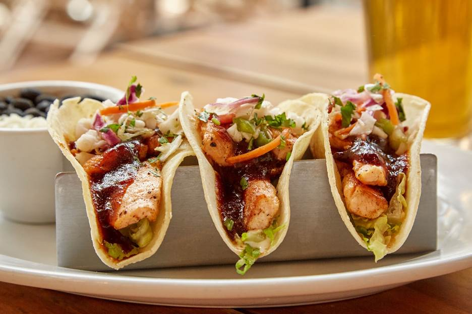 The second entrée on the Chalkboard is Chipotle BBQ Salmon Tacos, with apple cider slaw, shredded romaine, cilantro, Cuban black beans and rice, $15.99.