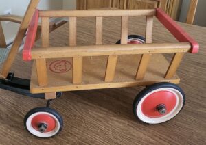 By the 1950s, the red wagon became an iconic American toy vehicle. At that time, Radio Flyer wagons were marketed to specialty audiences like the Mouseketeers from the Mickey Mouse Club or adventurous kids that wanted to ride in a Davy Crockett style wagon. Steiff, the popular German toy and teddy bear manufacturer, manufactured wagons featuring their teddy bear logo to accommodate every child’s holiday gift haul of toys. This marketing strategy helped the collectibles market for the wagons prompting many collectors to add them to a long list of must haves.
