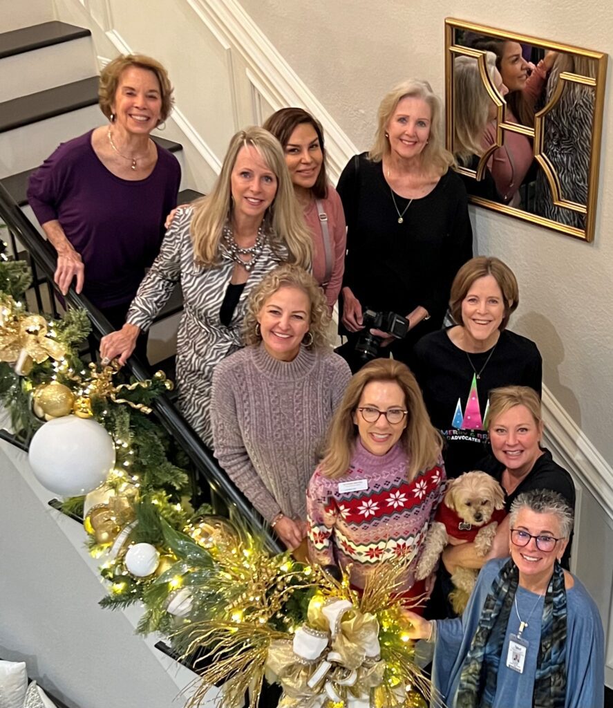 Shown front row, top to bottom are: Charlotte Davis, Child Advocates of Fort Bend Events Specialist Tarina Sheridan, Denise Druzbik-King, Child Advocates of Fort Bend CEO Ruthanne Mefford, and Pat Somers. Back row, top to bottom are: Liz Keshani-Fisher, Jessica Kij, Nancy Dale and CAFB Development Director Lisa Moore (holding Ginger).