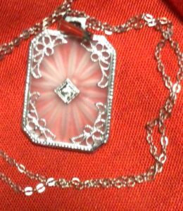 Easy to mass produce, camphor glass became a welcomed addition to the host of materials used in jewelry making. Camphor glass makers tried to imitate rock crystal. How did they do it? Camphor glass is achieved by treating clear glass with hydrofluoric acid vapors to get a frosted finish. This frosted or cloudy finish was a desired look, and today, it is making a big come back in the jewelry collecting world. The word “camphor” refers to the resin extracted from camphor trees and the exotic nature of the jewelry pieces were of interest to Art Deco socialites and flappers alike.