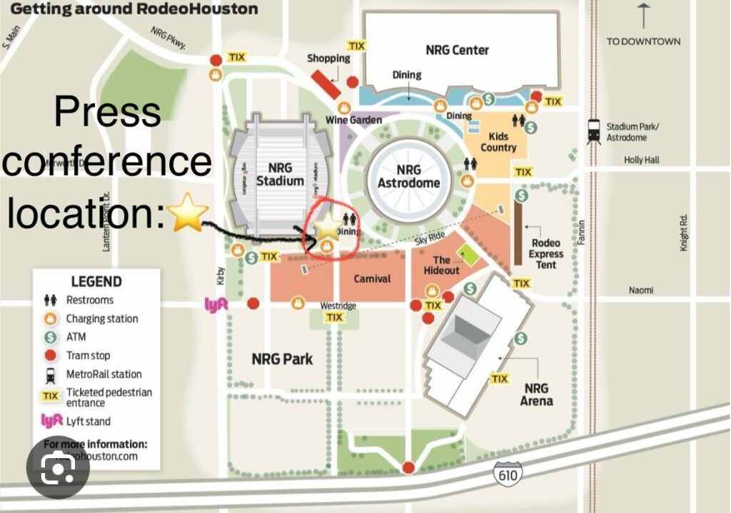 Where: 1 NRG Parkway, Houston 77054, Use N. Stadium Drive (Gate 12) for entering and exiting NRG Park and park in the Red lot. Once parked, media will walk in between the Astrodome and NRG Stadium to the SE corner of the exterior of NRG Stadium.