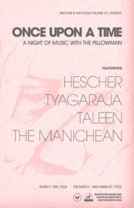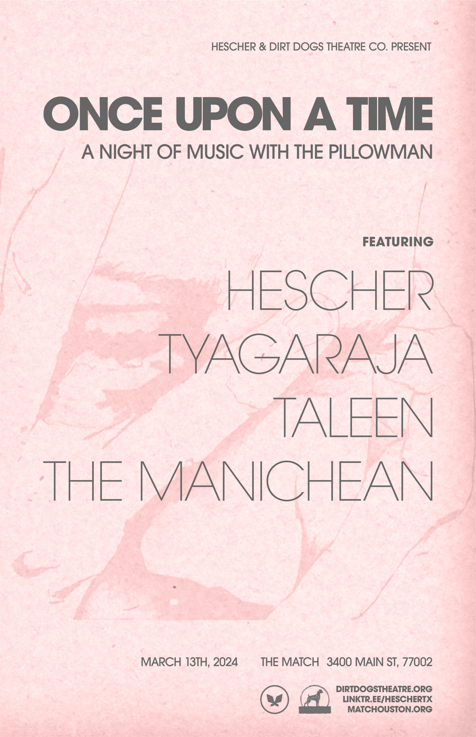 A night of live music in a theatre setting to celebrate The Pillowman, the award-winning play by Martin McDonagh, presented by Texas artist and musician Hescher in collaboration with Dirt Dogs Theatre Co. The Pillowman is being staged by Dirt Dogs Theatre Co. at the Midtown Arts & Theater Center Houston for eleven performances in March along with this special event, an evening dedicated to music and storytelling inspired by the play, and providing a unique way to engage with the challenging and emotional themes present in McDonagh’s play.ONCE UPON A TIME features performances from The Pillowman’s original music composer Hescher, as well as Palestinian-American artist and activist Taleen, Texas songwriter and permaculturist Tyagaraja, and Houston-born “Rock/Folk/Whatever” duo The Manichean, performing together for the first time in over ten years.One night only, limited seating, tickets on sale now at matchouston.org.