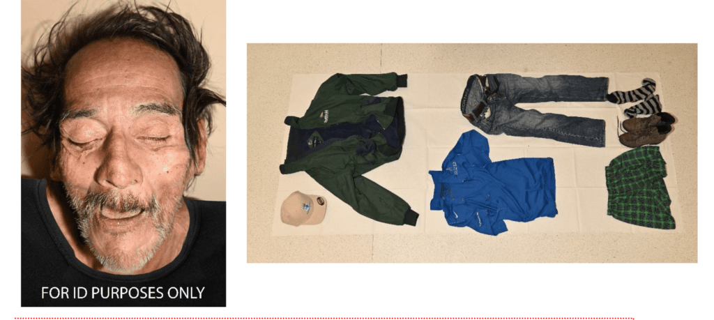 ADDITIONAL IDENTIFIERS: The decedent has no tattoos. He was wearing a cream colored baseball style cap with logo and label for “Buffalo Bayou Partnership”, size S/M; dark green jacket with dark blue interior with logo and label for “SeaWorld Adventure Parks” on left chest, “Port Authority” brand, size S; bright blue polo shirt with white logo and label for “Ascend Performance Materials” on the left chest and the “Nike Swoosh” on the right sleeve, “Nike Golf” brand; blue jeans, “American Eagle” brand, size 26×28; brown leather belt with oval shaped buckle decorated with clear stones; green-blue plaid boxer underwear, “Hanes” brand; gray and black striped socks; brown/gray boots with laces and zipper on inner ankles, “Sporto” brand “Leslie2” style, size 7M US. Clothing pictured below. More photos available on NamUs website.