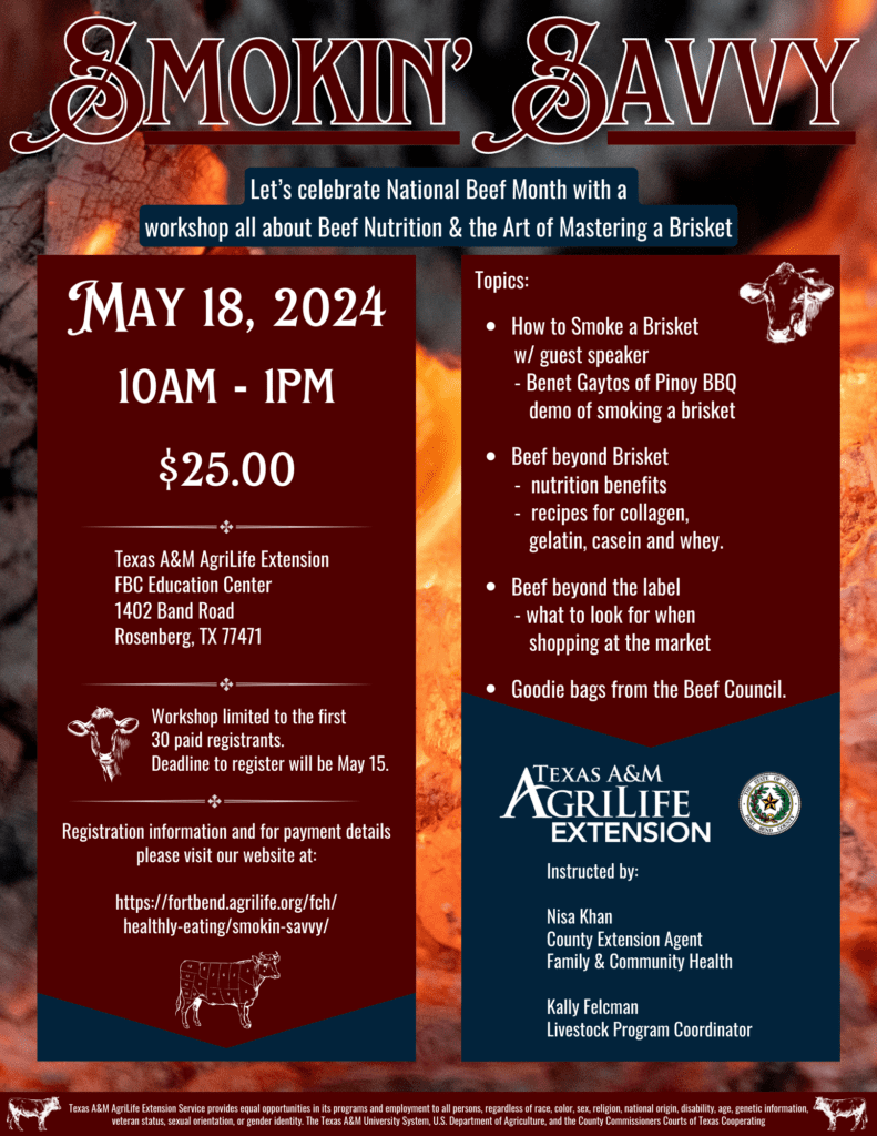 May is National Beef Month and we want to celebrate! Texas A&M AgriLife Extension Service of Fort Bend County is thrilled to announce a collaborative effort between Livestock Coordinator, Kally Felcman, and County Extension Agent for Family and Community Health, Nisa Khan. Together, they’re hosting an engaging workshop to delve into the art of smoking brisket, its nutritional benefits, and understanding how the cattle industry contributes to our society.
