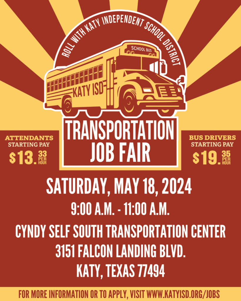 KATY, TX [May 8, 2024] – Mark your calendar for the Katy Independent School District (Katy ISD) Transportation Job Fair on Saturday, May 18! The district is actively seeking qualified candidates for bus driver and bus attendant positions.