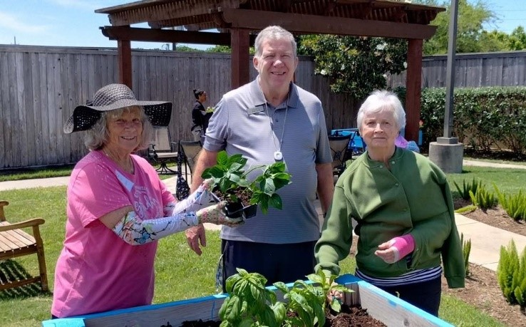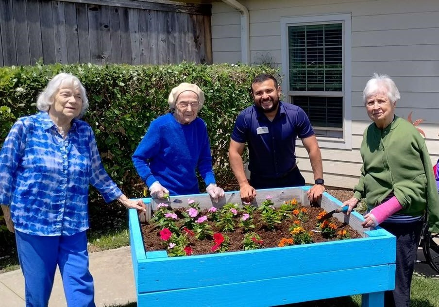 In the fall, the community’s raised planter boxes were repaired and updated with the help of Boy Scout Troop #209 of Katy, which prepared them for easy and accessible spring planting. With warmer weather now here, members of the community took full advantage of the Earth Day call to action, sharing time, energy, and resources to ensure a clean and beautiful courtyard space for memory care residents.