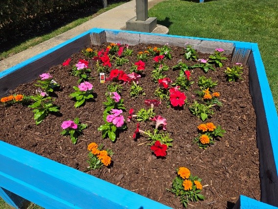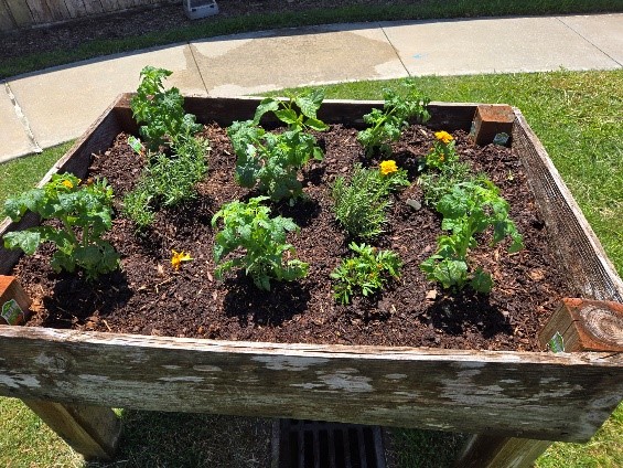 With 37 bags of garden soil, the community planted a few favorite vegetables, herbs, and annuals, including sweet banana peppers, basil, bell peppers, rosemary, cherry tomatoes, petunias, vincas, periwinkles, and marigolds.