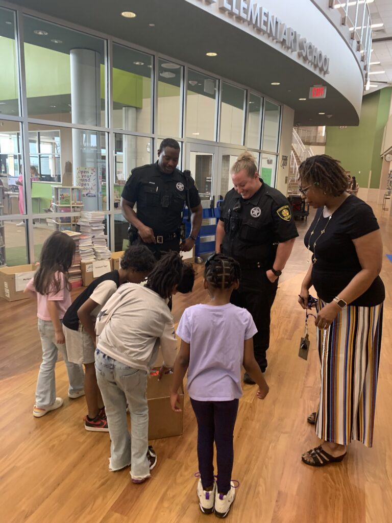 Photo #2 – Precinct 1 – Deputy Constable Litvik and Deputy Constable Atkins – Delivery books to outgoing First Graders