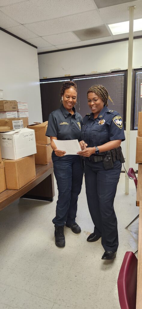 Photo: #1 – Precinct 2 – Deputy Constable Theresa Gibson and Assistant Chief Pennie Jackson – Gathering books for delivery