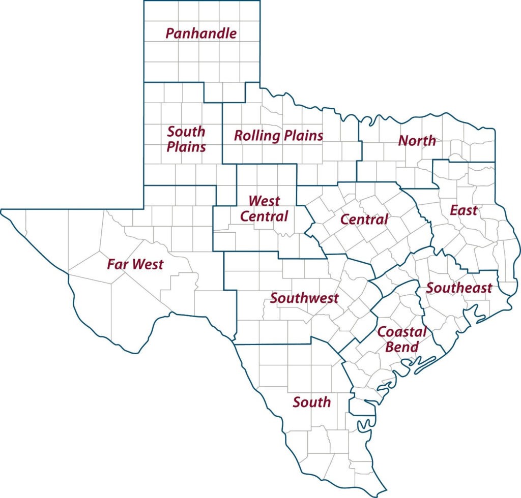 A map of the 12 Texas A&M AgriLife Extension Service districts.