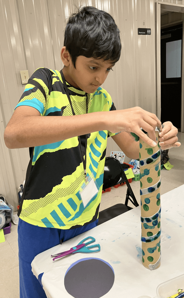 Another first-time activity for campers came from JMG Advance Trained Master Gardener Lynn Lucas of Fulshear who provided materials for them to create and decorate rain sticks from thick cardboard cylinders lined with metal screening and then filled with stones. When the sticks are turned, they make a noise similar to falling rain.