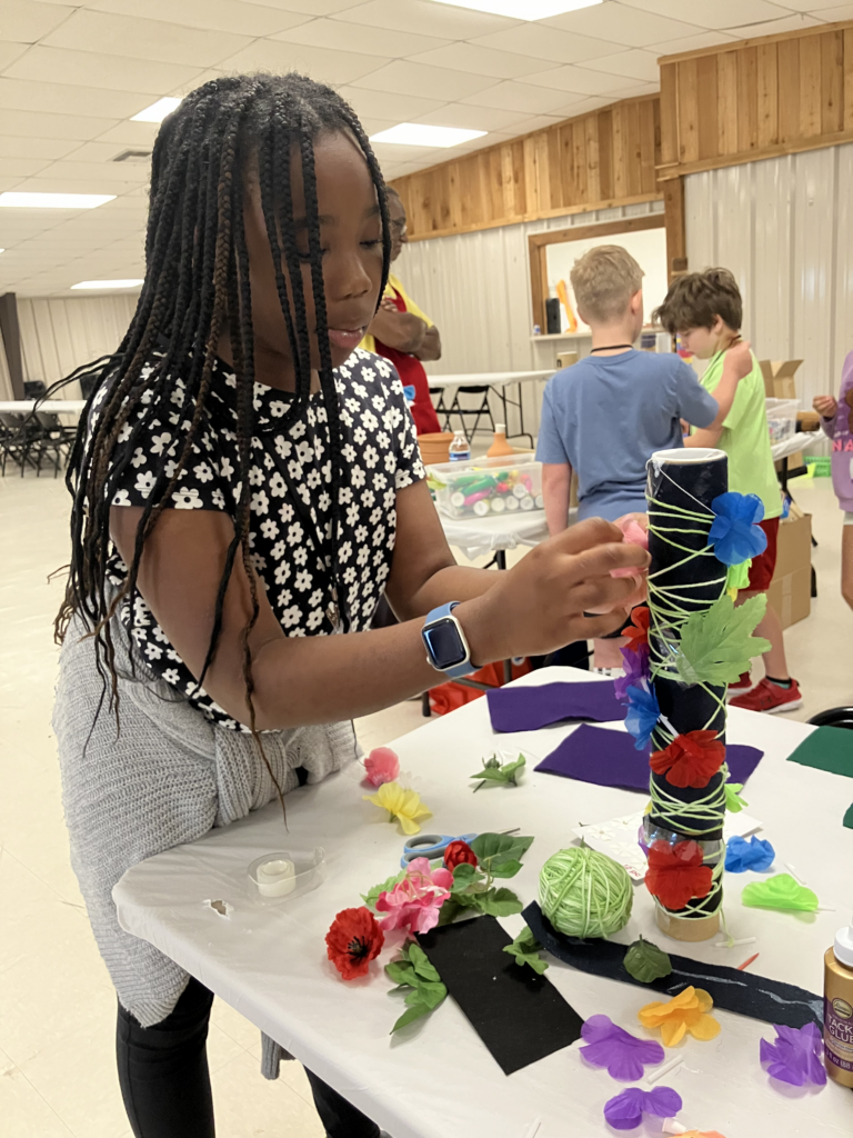 Incoming fifth-grader Jayda attached flowers to her rain stick. This was her first year at camp. “I like doing the arts and crafts. I learned about parts of the flower and different butterflies. It’s been fun and I’ve learned a lot.”