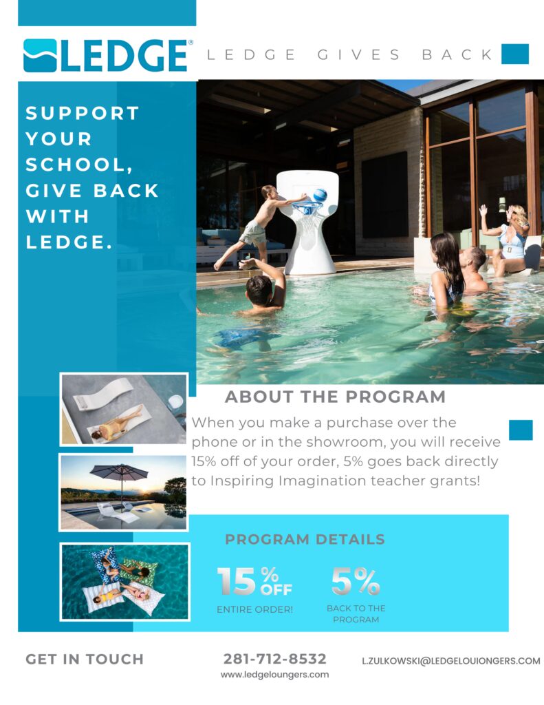Katy, TX – Katy-based LEDGE Lounger, a leader in high-quality in-pool and outdoor furniture, is proud to partner with the Katy ISD Education Foundation to give back to local teachers, students, and classrooms. Effective immediately, when customers mention the Katy ISD Education Foundation during phone or showroom purchases, they will receive 15% off their order and 5% of the total purchase will be donated to the Foundation’s Inspiring Imagination teacher grants.