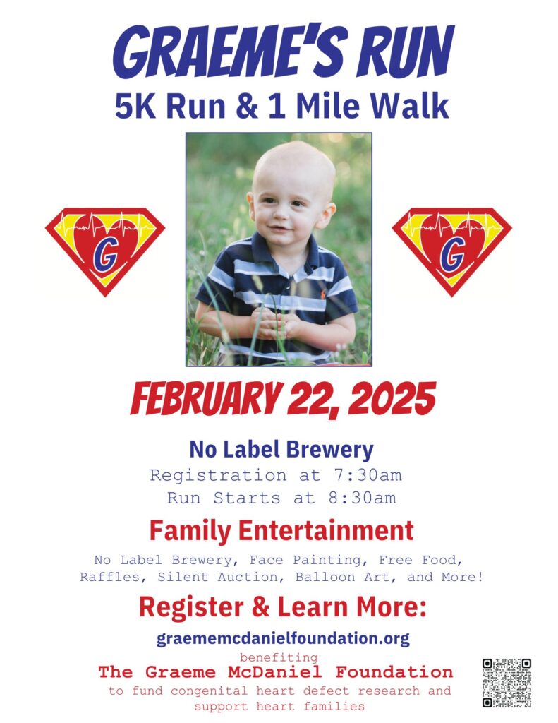 This will be our 10th year, and the date is set for February 22, 2025 (February is heart awareness month). Our 10th Graeme’s Run will be full of fun activities for everyone! We will have a 5K and a 1-mile family walk in Old Katy starting and ending at No Label Brewery.