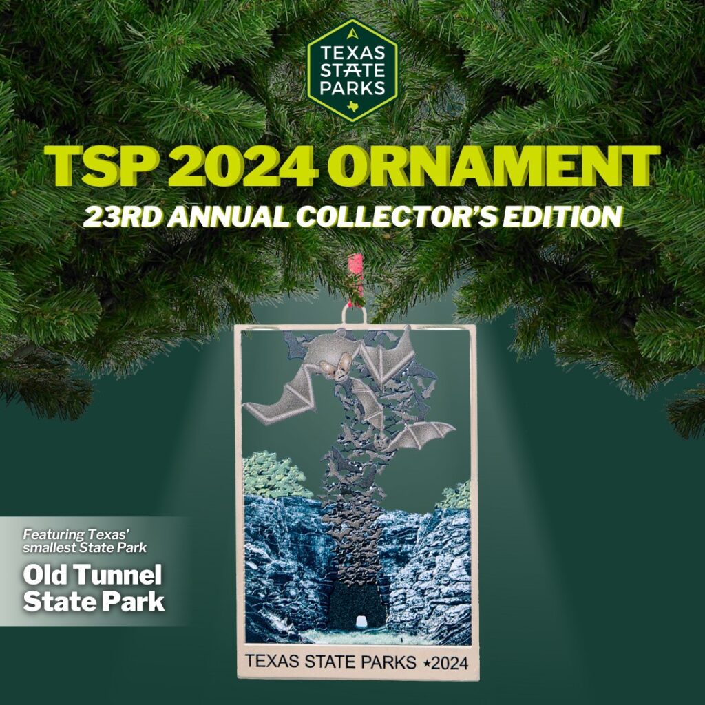 This year’s ornament features the smallest state park, Old Tunnel, known for its bat populations. The park is home to up to 3 million Mexican free-tailed bats and 3,000 cave myotis bats from May through October. The ornament prominently features these bats emerging from Old Tunnel. Each purchase helps support Texas State Parks and adds a tiny slice of Texas charm to the tree.