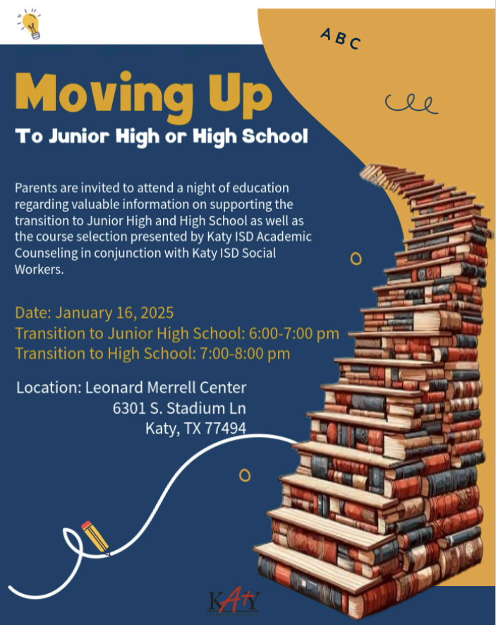 KATY, TX [January 14, 2025] – As the course selection period approaches, Katy ISD’s Legacy Parent Academy will host an in-person session titled “Moving Up to Junior High or High School.” This event is designed to provide students and parents with valuable information about the transition to junior high and high school. The session is free for families, and no registration is required.