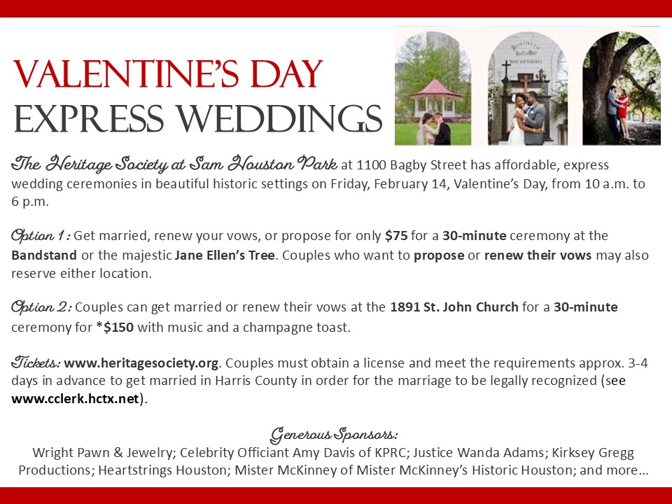 To book your wedding event or for more details, please see  https://www.heritagesociety.org/express-weddings-valentines-day.  Vow renewals are also available for $75 and $150 ceremonies. For those planning weddings on a different date, they may see all of The Heritage Society’s wedding and facility venue spaces in Downtown Houston at  https://www.heritagesociety.org/wedding-special-events.