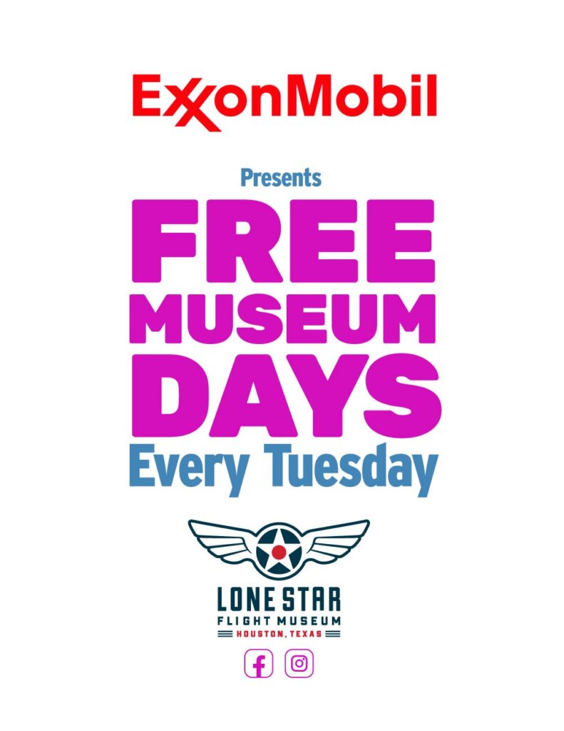 HOUSTON, TEXAS – The Lone Star Flight Museum (LSFM) is excited to announce Free Museum Days presented by ExxonMobil. For one year, every Tuesday will be free for the museum’s general admission visitors.