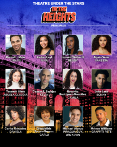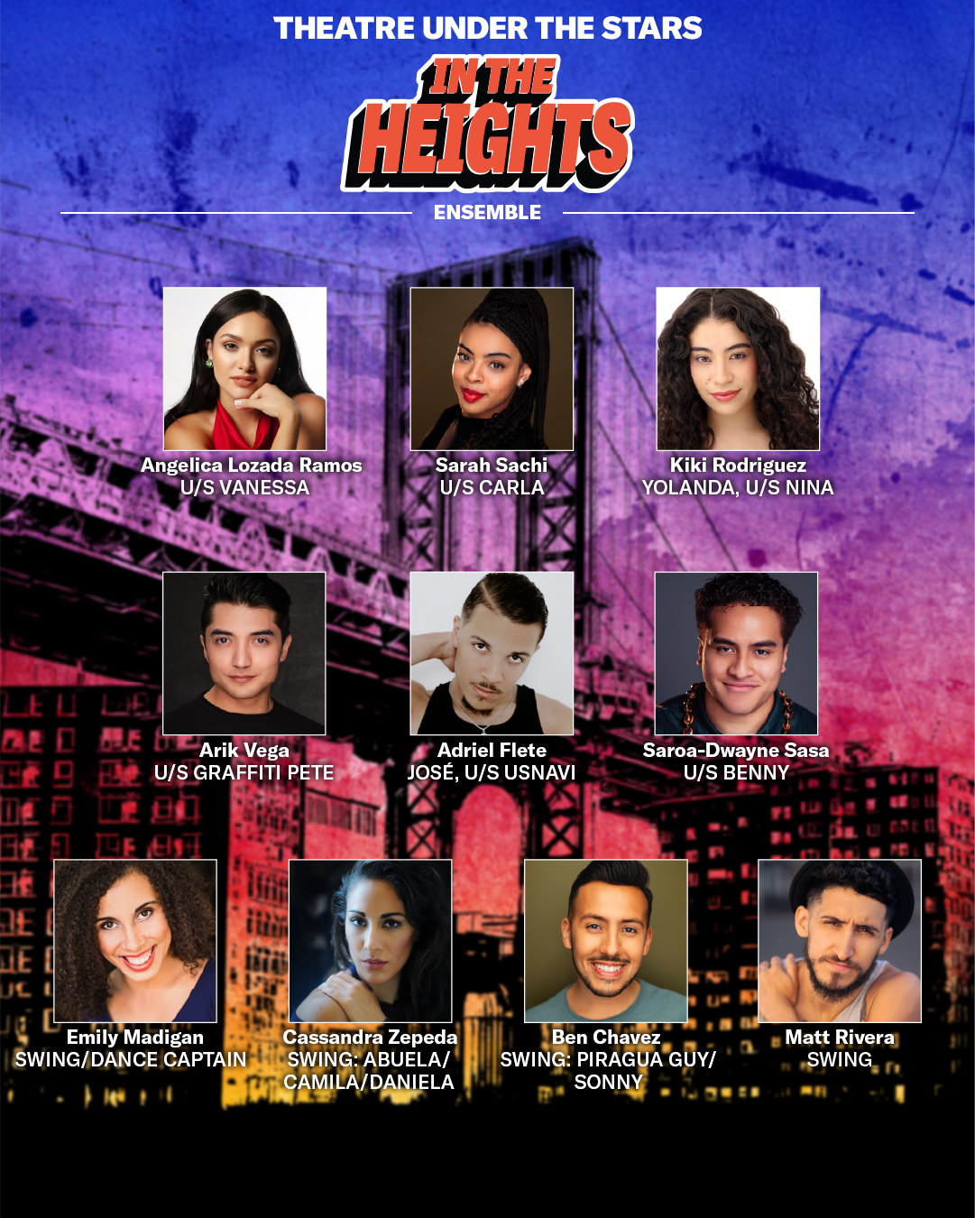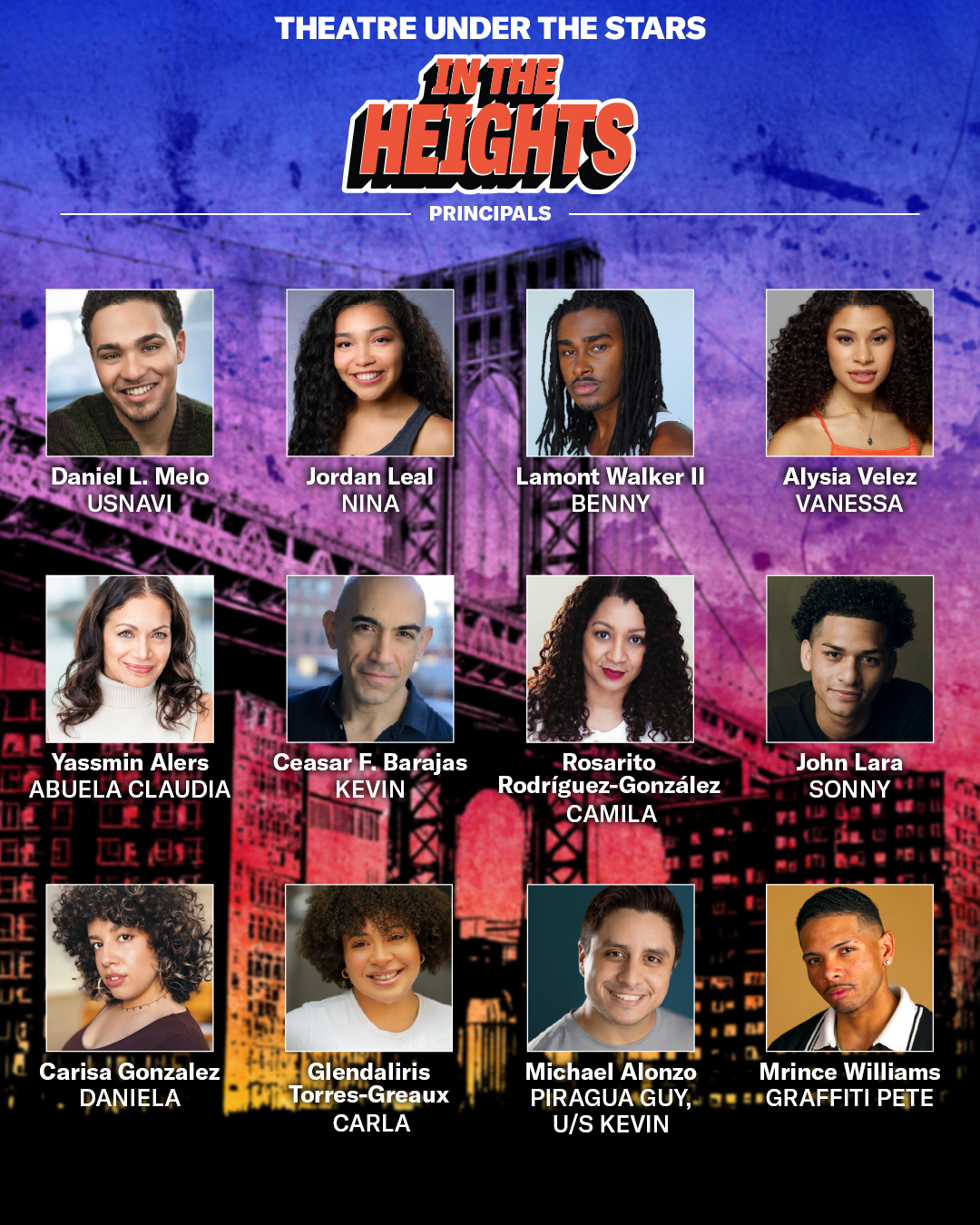 Leading the cast is Daniel Melo as “Usnavi,” Jordan Leal as “Nina,” Yassmin Alers as “Abuela Claudia,” Rosarito Rodriguez as “Camila,” Cesar F. Barajas as “Kevin,” John Lara as “Sonny,” Alysia Velez as “Vanessa,” Lamont Walker II as “Benny,” Carisa Gonzalez as “Daniela,” Glendaliris Torres-Greaux as “Carla,” Michael Alonzo as “Piragua Guy,” and Mrince Williams as “Graffiti Pete.”