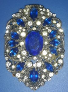 The importance of a brooch’s setting –preferably in precious metals–should not be overlooked. Look for classic settings like circles, wreaths, snowflakes, or flower forms. Prongs are a quality indicator for both fine jewelry or costume jewelry brooches. Look for prongs holding in crystals, gemstones, or other cut stones and remember, the more prongs the better. Most faceted cut gemstones are set with at least four, but even better if there are six, prongs. Prongs should be curved and tightly set to secure the gemstone on a brooch. Pinback clasps can come in many types including c-clasps or rotating clasps to secure the brooch to the clothing garment or coat. These settings are important to value and the look of a brooch.