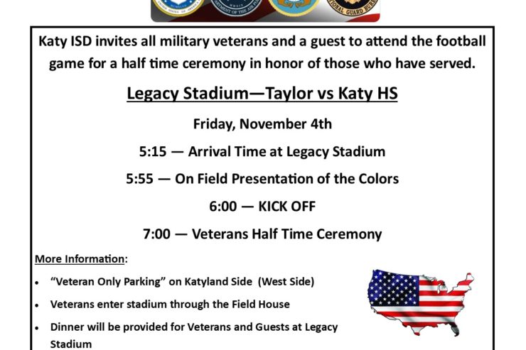 Katy ISD invites all military veterans and a guest to attend the football game for a half time ceremony in honor of those who have served. Legacy Stadium—Taylor vs Katy HS Friday, November 4th 5:15 — Arrival Time at Legacy […]